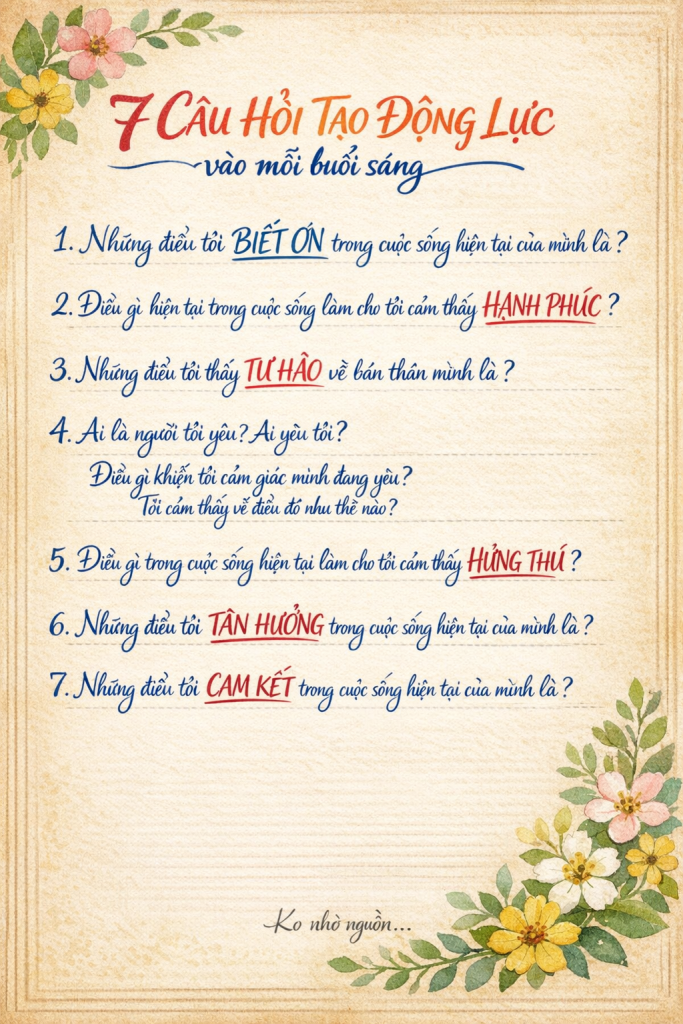 Đôi khi, vấn đề không phải là thiếu kiến thức,mà là thiếu sự quay về với chính mình.Có những điều ta biết rất rõ…nhưng rồi lại quên thực hành mỗi ngày. Sáng nay chào bình minh, ngồi viết lại 7 câu hỏi tạo động lực… như để nhắc mình hiện diện hơn với cuộc đời.BIẾT ƠN …